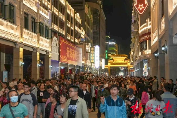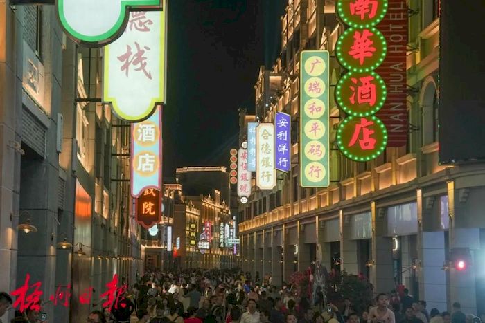 11月10日晚,航拍视觉俯瞰,骑楼城灯火辉煌,人流如织。何鎏 摄