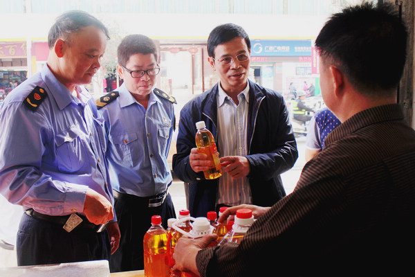 蓝明月(左三)带队到农贸市场察看食用油卫生情况